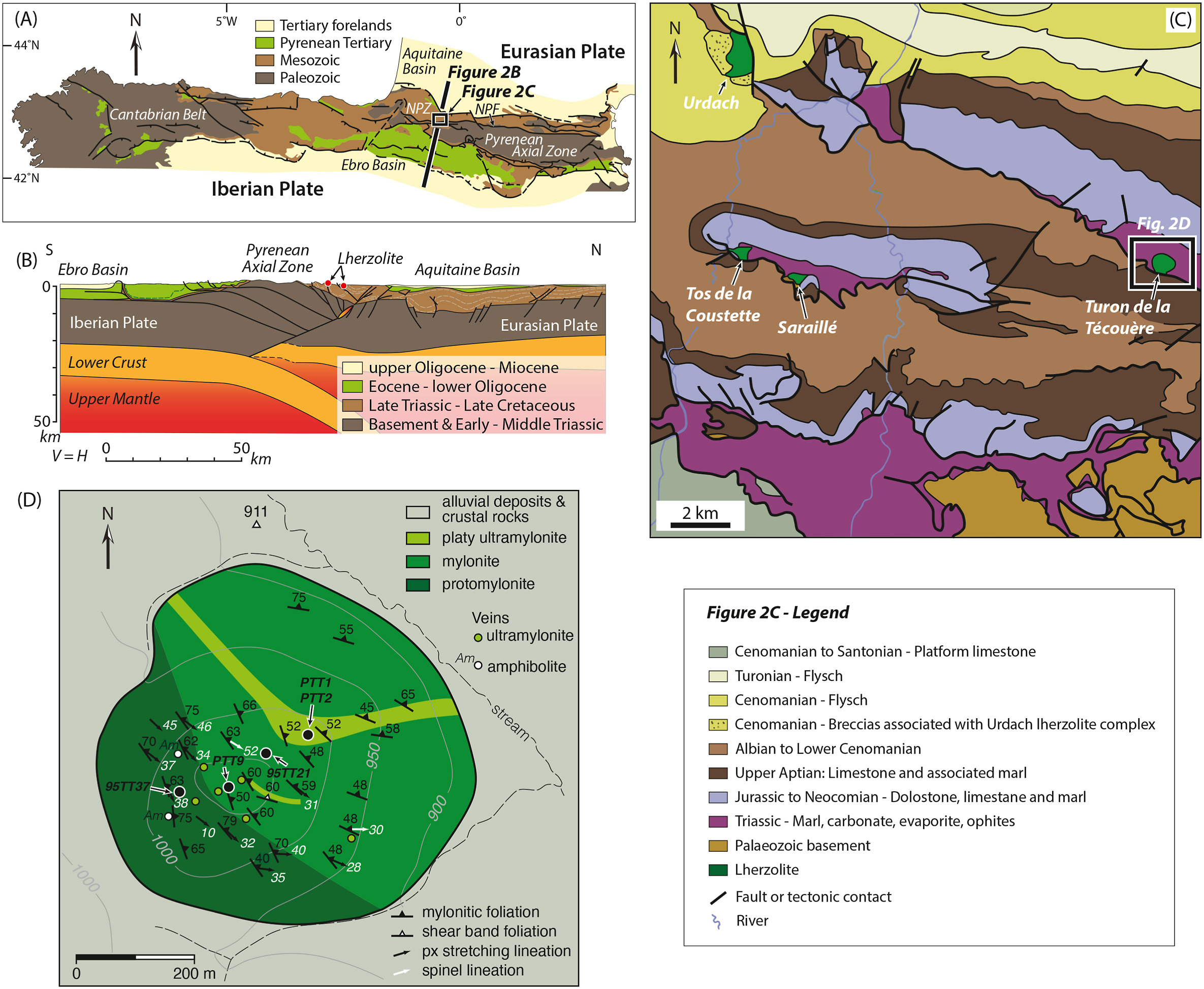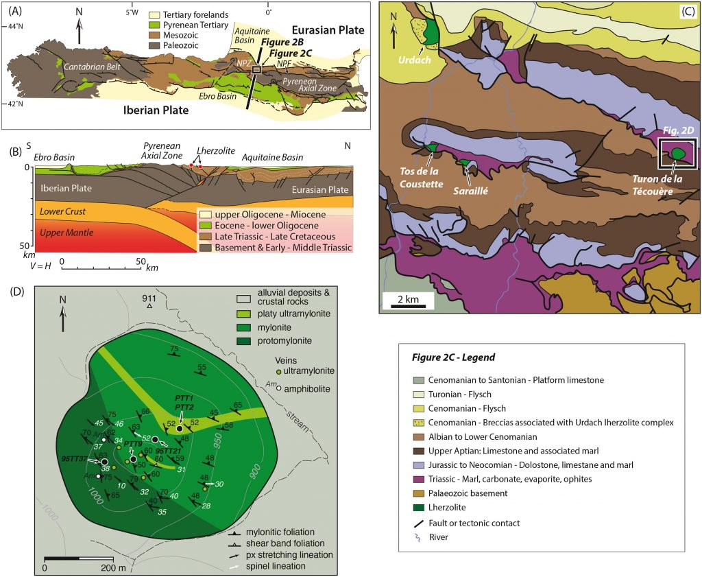 This study shows that constant displacement rate conditions – imposed by plate tectonics – is the best approach to consider the evolution of extensional plate-boundary shear zones, as stresses vary during deformation. The Turon de Técouère massif of the French Pyrenees preserves a Cretaceous, magma-poor hyperextended plate margin within the lithospheric mantle. The massif exposes an extensional shear zone hosted in lherzolite. The present-day structure of the shear zone, frozen at 750 °C, consists of a ∼40 m thick ultramylonite, bordered by a ∼200 m thick mylonite and a protomylonite >100 m thick. The ultramylonite overprinted a ∼40 m-thick mylonite that was active between 1000 and 850 °C, while the shear zone became thicker with time. Using displacement rates, determined from tectonic analyses, and strain rate estimates, determined from microstructural analyses, the calculated thickness (8–20 m) of the shear zone is less than the observed thickness (40–200 m) at different temperature conditions experienced by these rocks. Therefore, the shear zone is thicker than necessary to accommodate the plate motion. This result indicates that the Turon de Técouère shear zone likely represents the entire divergent plate boundary at conditions of the lithospheric mantle. We introduce the concept of a “jump around” shear zone – in which a smaller zone of active shearing moves around within a thicker zone of deformation – to explain the discrepancy between the thinner shear zones predicted by strain rates and the thicker observed shear zone.